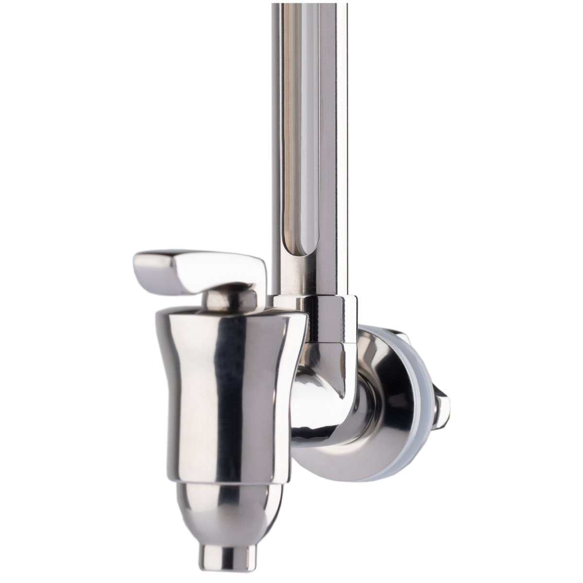 - D’un pied en acier inoxydable permettant de placer confortablement un verre sous le robinet.