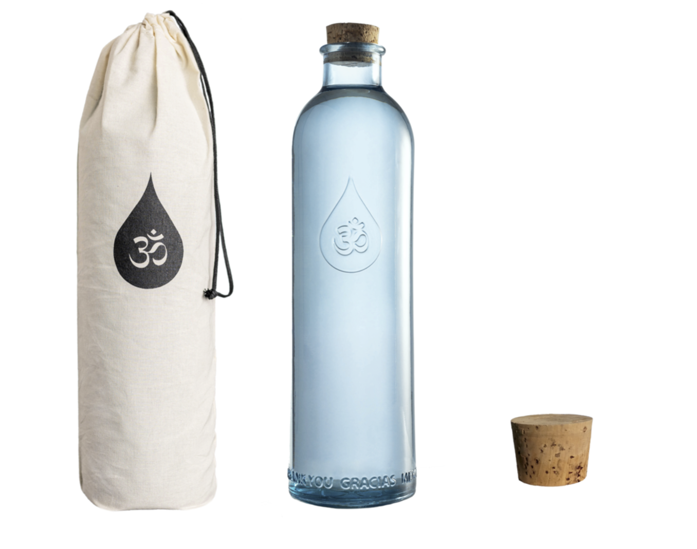 La bouteille OmWater est d'une essence Sacré avec gravé dessous Om Water Gratitude Bouteille de table en verre recyclé sans plomb 1.2L, avec bouchon en liège naturel.